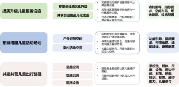 根据儿童的要求,以服务设施、活动场地、出行路径三个维度,从共享型和专享型两个方面,构建“三类两型”空间要素体系,从建设规模、服务半径、规划要求等方面,明确社区户外及室内儿童活动空间的建设要求。