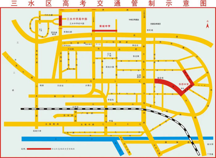 三水区考点设在三水中学高中部、华侨中学、实验中学,为确保考生在高考期间不受干扰,交警部门将对以下路段实施交通管制: