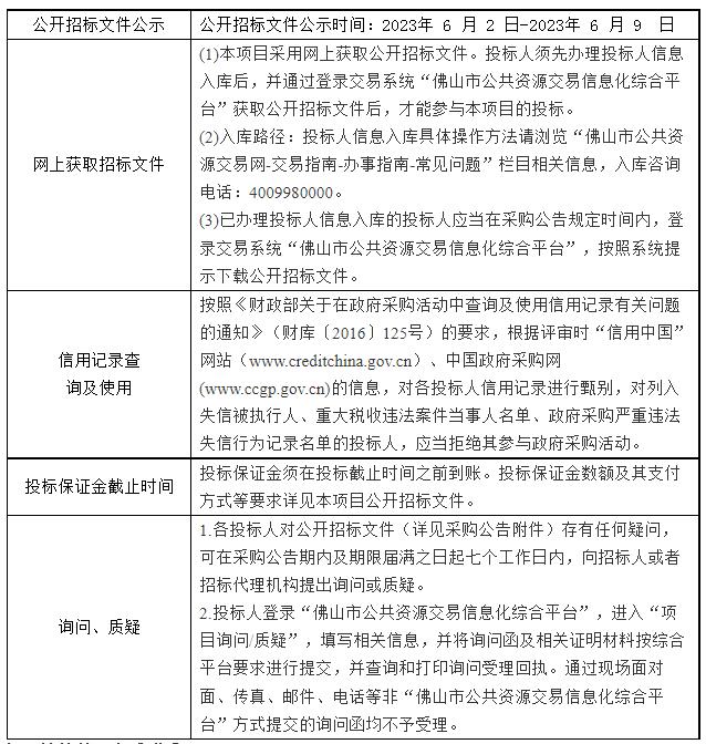 提交投标文件地址:佛山市禅城区季华五路28号公交大厦6楼佛山市公共资源交易中心开标 6 室。