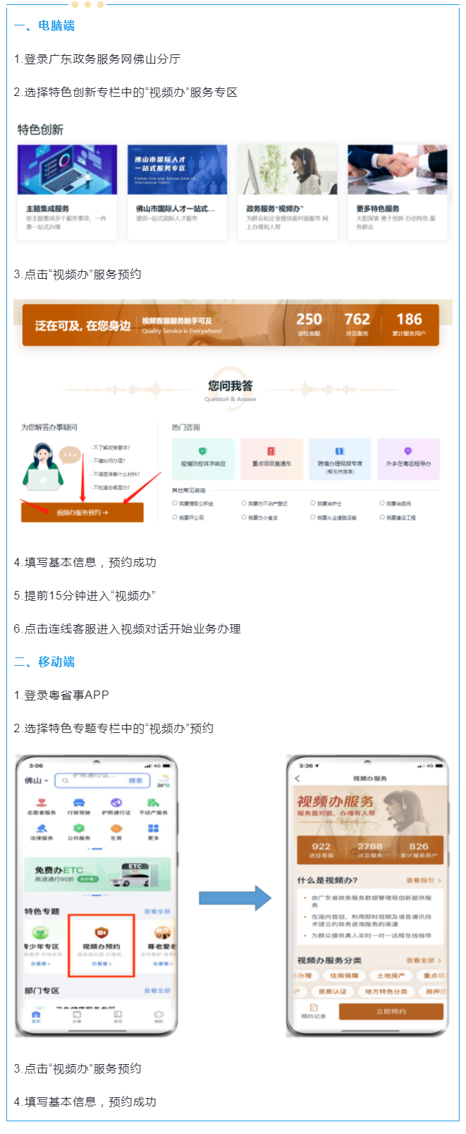 近日,按照广东省加快推进政务服务标准化规范化便利化的工作部署,为推动佛山“可视化”政务服务发展,佛山市基于“粤视会”平台全省统一的政务服务“视频办”服务专区,打造广东省政务服务网佛山分厅政务服务“视频办”特色专题,进一步提升佛山政务服务便利化水平。