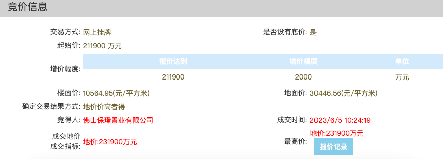 地块逾21亿元起拍,最终保利以总价约23.19亿元竞得,楼面价10565元/㎡,溢价率9.44%。
