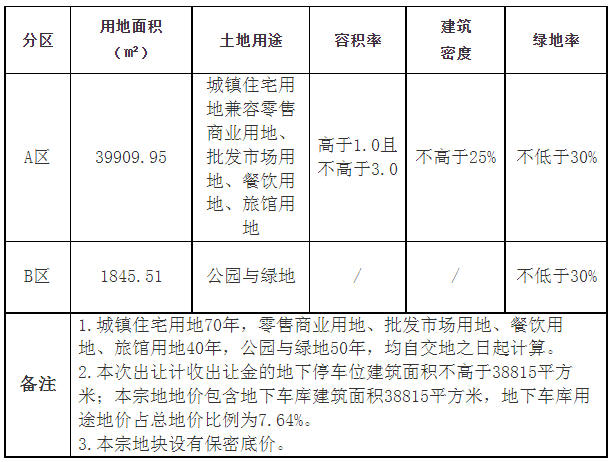 2.本次出让计收出让金的地下停车位建筑面积不高于38815平方米;本宗地地价包含地下车库建筑面积38815平方米,地下车库用途地价占总地价比例为7.64%。