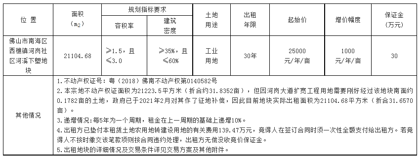 七、自本次公告起至网上挂牌截止期间,如有关于本地块网上挂牌出租文件的修改、澄清、说明等将通过上述网上交易系统、佛山市南海区人民政府网发布,不再另行通知,请有意参与竞租者密切留意。其它未尽事宜,详见本地块的网上挂牌出租文件。