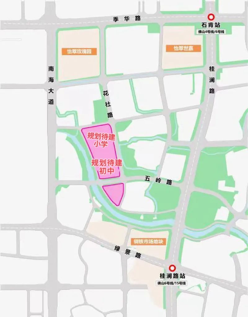 此次亮相的规划学校,位于石(石肯)片区核心地块,临近南海大道、桂澜路等主干道。规划学校包含一所24班小学、一所36班初中,计划于近期动工。