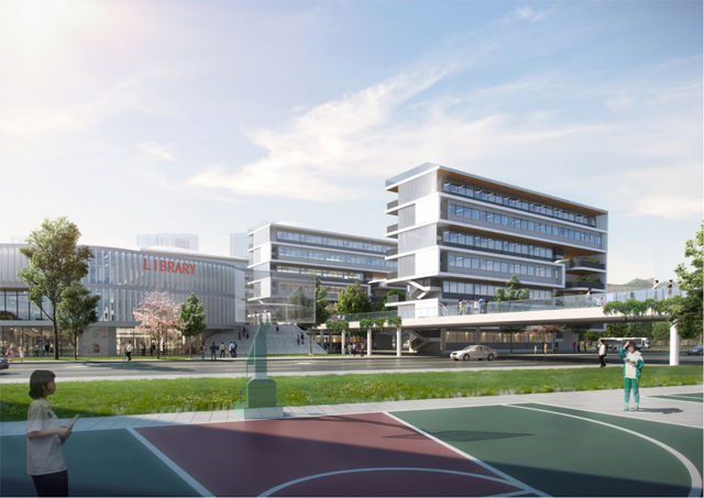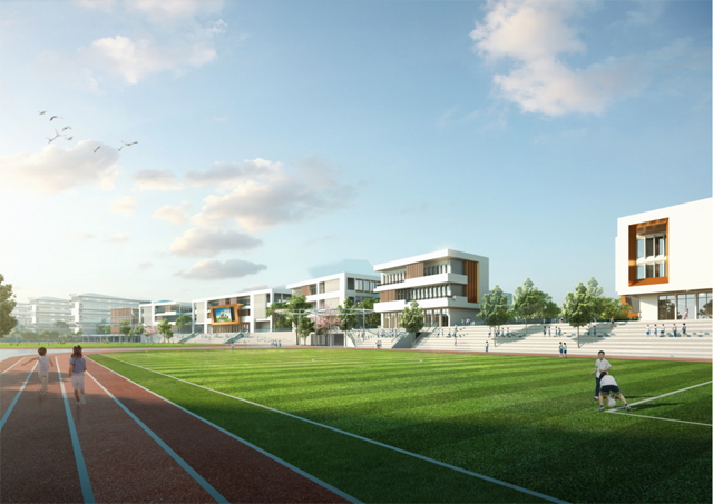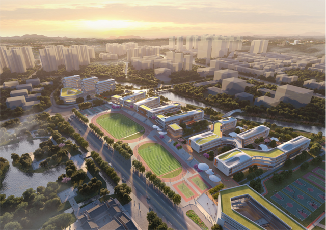 值得注意的是,两所校园将创新采用“共享中轴”的概念,以一条500米长的共享学习长廊,串联起两所学校场地,将两大操场、数十个篮球场和羽毛球场等多种教学使用场景汇聚于一体,形成极具特色性、文化性和互动性的交流空间。