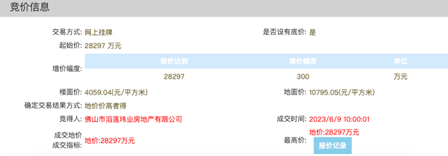 6月9日,南海区西樵镇碧霞三路北侧一宗约2.6万㎡商住地以总价28297万元成功出让,由 佛山市滔莲玮业房地产有限公司摘得,折合楼面价约4059元/㎡。