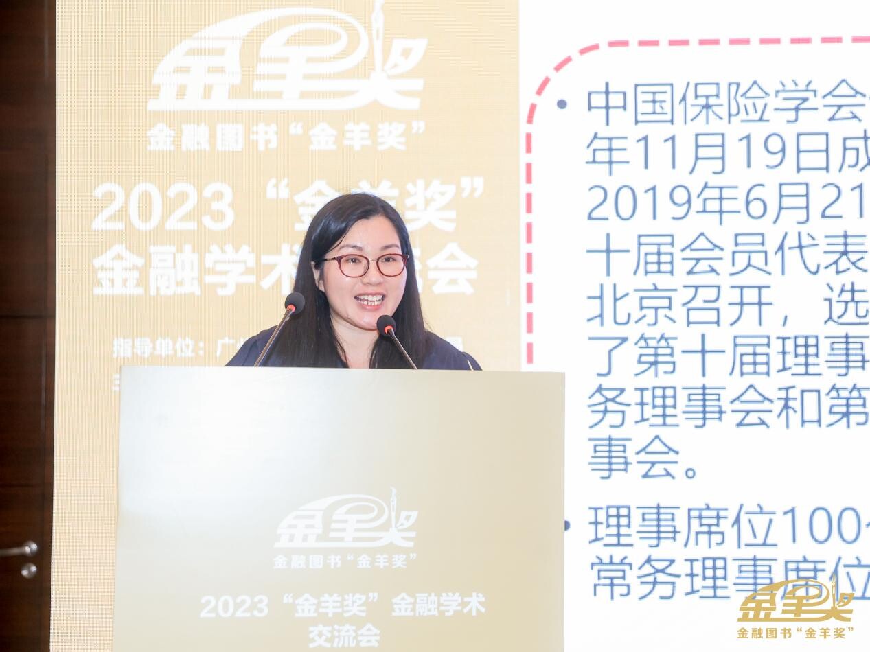 图注:广东工业大学法学院副教授,第十一届金融图书“金羊奖”获奖图书《中国近代保险史》作者代表曾金莲发表主题分享