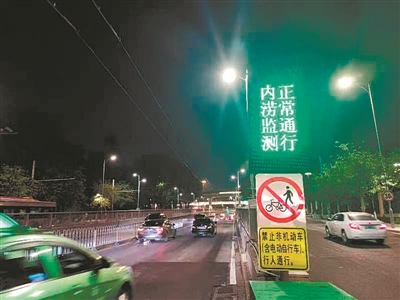 大北立交前的LED屏显示“内涝监测,正常通行”