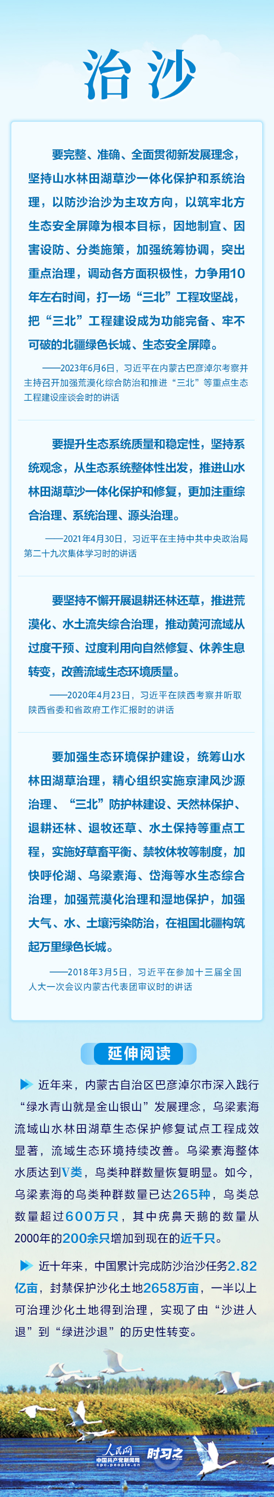 2023年6月5日至6日,中共中央总书记、国家主席、中央军委主席习近平在内蒙古自治区巴彦淖尔市考察,主持召开加强荒漠化综合防治和推进“三北”等重点生态工程建设座谈会并发表重要讲话。