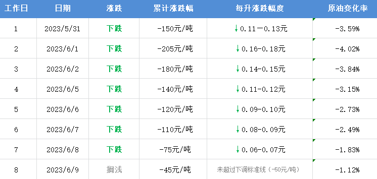 国内油价预计下调幅度再度缩减,已由最高下调205元/吨缩减至140元/吨。预计汽柴油下调140元/吨,折算下调0.11-0.12元/升,下一次油价调价窗口时间为6月13日24时。当前预测仅供参考,具体油价调整情况以国家发改委13日公布的为准。2023年以来,国内成品油价格经历多次调整,最近一次调整为5月30日24时国内汽、柴油价格每吨分别提高100元和95元。
