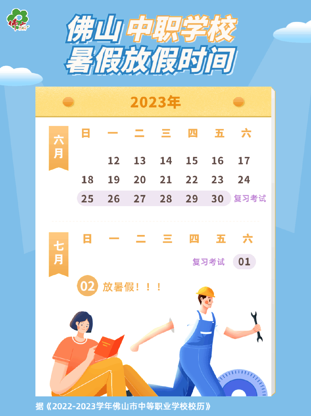 按照《2022-2023学年佛山市中等职业学校校历》安排,全市中职学校暑假起始时间为2023年7月2日。