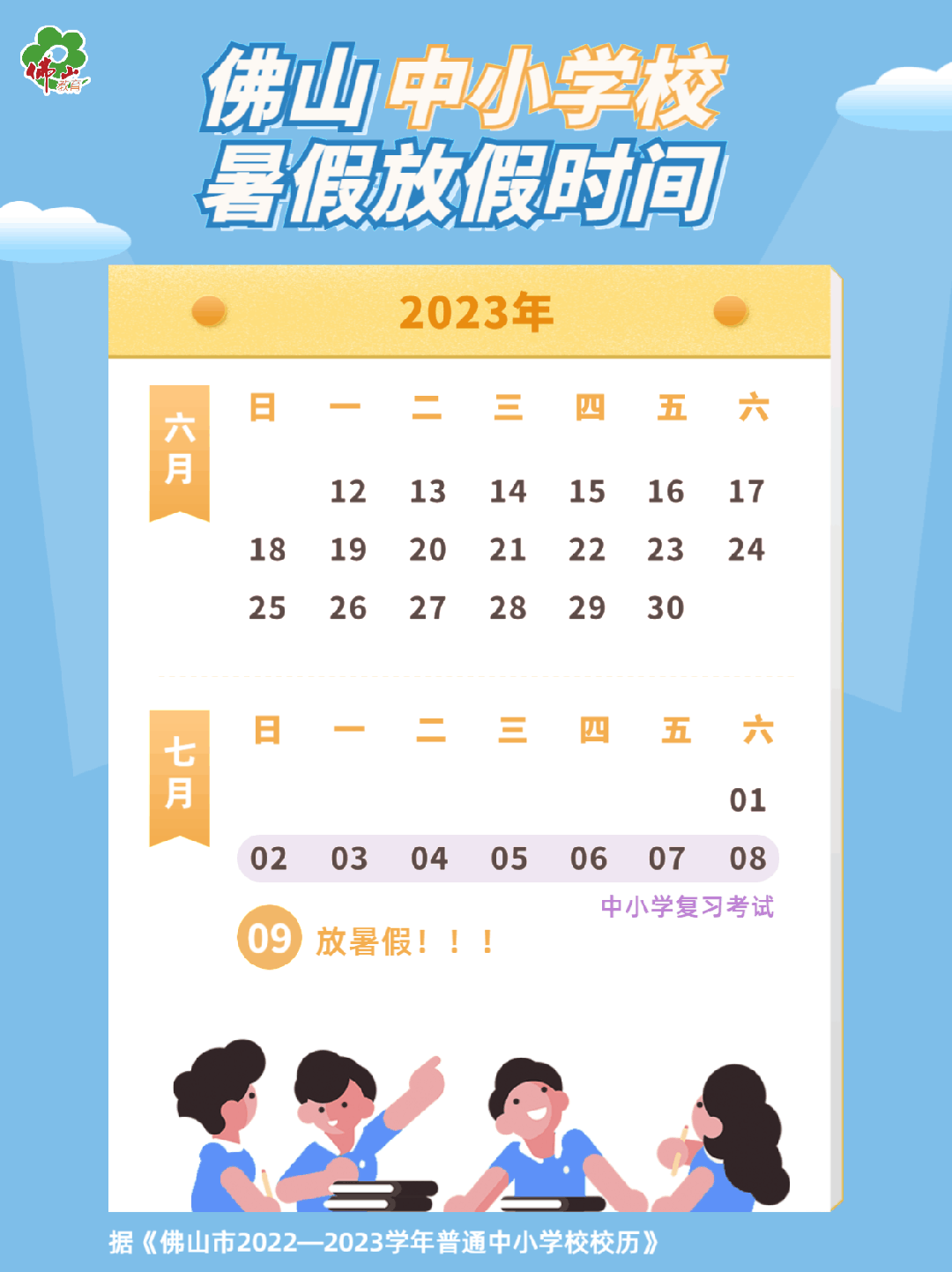 按照《佛山市2022-2023年度全日制普通中小学校校历》安排,全市普通中小学校暑假起始时间为2023年7月9日。