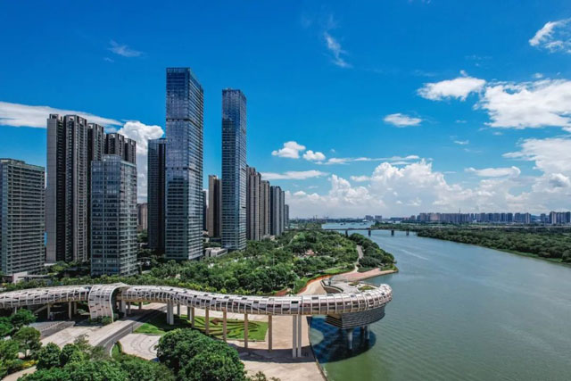 项目由一座五十层的塔楼、三层裙楼以及两层地下室组成,塔楼高200米,将打造为顺德“城市空中客厅”和崭新的城市地标,成为宾客俯瞰顺德美景和感受繁华的首选之地。项目结合周边地块打造TOD连廊,围绕着“以人为本”概念,以“交通一体化”为设计核心,打造地下、地面、空中三维立体交通体系。同时,通过打造地上风雨连廊与地下景观通道,实现与地铁出入口枢纽空间的无障碍转换,建立人与区域更紧密的连接。