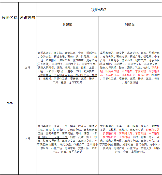 505B线路取消停靠上良、大楠、人和圩(南行)、清泰、第村、葫芦岗、宝鸭山墓园、装备制造园区等站点。