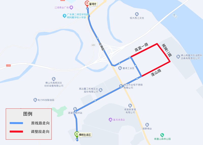 为进一步扩大线路服务范围,方便富湾工业区市民出行,536线路取消途经东诚路,调整途经高富一路(东诚路至高富二路段)、高富二路、蓬山路(东诚路至高富二路段)。