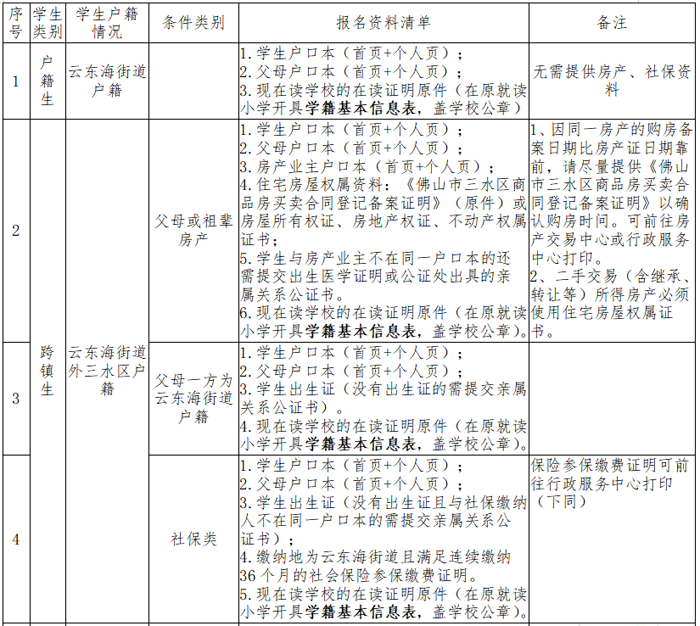 (二)录取办法:按照如下顺序录取:1.政策优待生;2.云东海街道户籍生;3.符合条件的佛山市非云东海户籍生(跨镇跨区生);4.政策性借读生。
