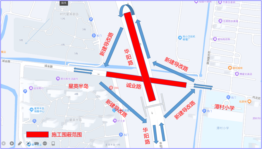 三、原由华阳桥方向往星英半岛方向(南往西)、潭村小学方向往星英半岛方向(东往西)的车辆,经新建辅道直行至路口北侧新开设掉头口掉头前往。