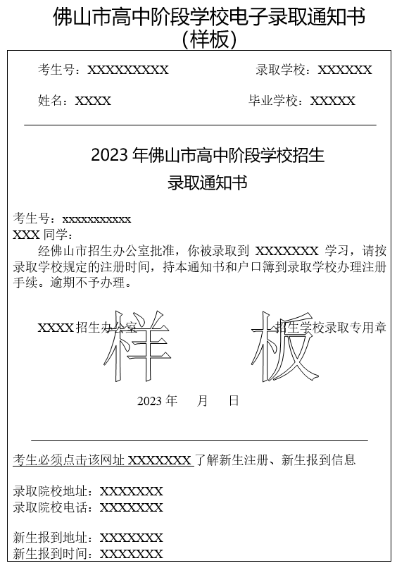 今年,佛山市高中阶段学校招生将继续实行网上录取。录取通知方式由考生登录佛山招考网免费获取电子《录取通知书》,招生学校不提供纸介质《录取通知书》。若考生有特殊需要,可凭身份证或准考证到所属区教育局打印纸质《录取通知书》。