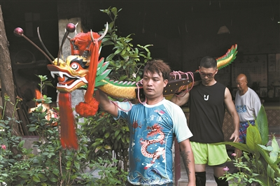 赛前一天,宦溪村提早结束训练,队员提前将龙头龙尾取出安装在龙船上