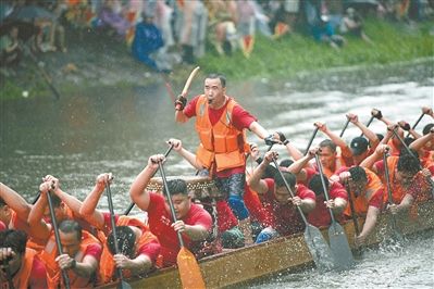 当日,前进宦溪村、珠村文华社、黄村1号船等10支龙舟队伍相继亮相,上演精彩角逐。比赛过程中,突然下起大雨,但是比赛没有暂停,参赛队员在雨中作战,两岸的观众也打着伞继续观赛。“有水意味着风调雨顺,龙舟总是和水打交道的,我们也常常冒雨训练,早已习惯。”一位参赛龙舟手说。