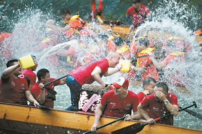 6月16日比赛日,龙舟队队员在鼓手的鼓点下奋力划桨,冲向终点