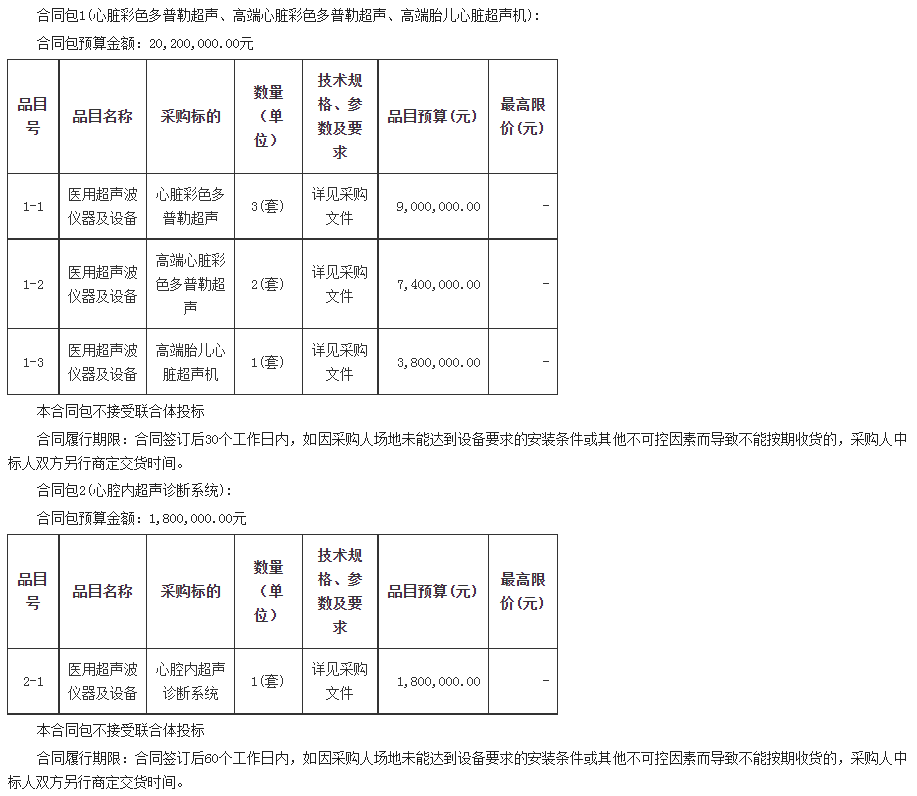 6.采购包1的投标总价最高限价金额不得超出人民币19100000.00元。其中,心脏彩色多普勒超声的投标最高单价金额不得超出3000000.00元/套,3套合计金额不得超出9000000.00元; 高端心脏彩色多普勒超声的投标最高单价金额不得超出3300000.00元/套,2套合计金额不得超出6600000元; 高端胎儿心脏超声机的投标最高单价金额不得超出3500000.00元/套,1套合计金额不得超出3500000元。