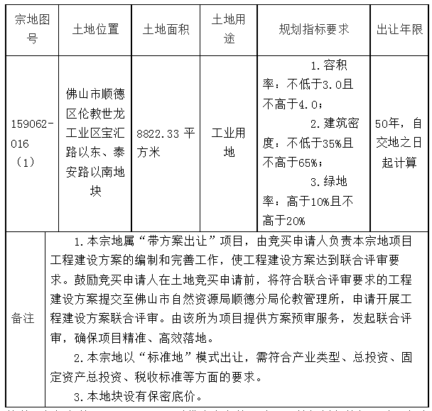 顺德区伦教世龙工业区宝汇路以东、泰安路以南地块使用权挂牌出让公告