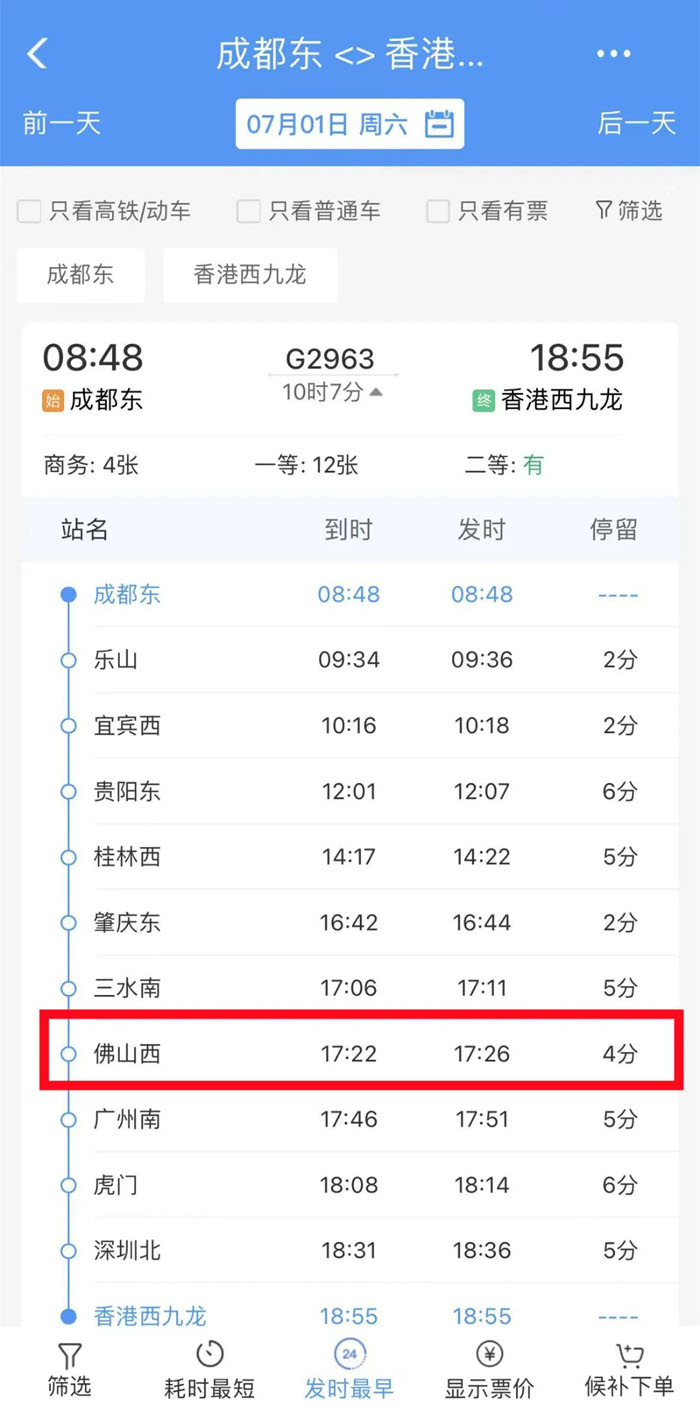 佛山西可直达成都东、香港西九龙!
