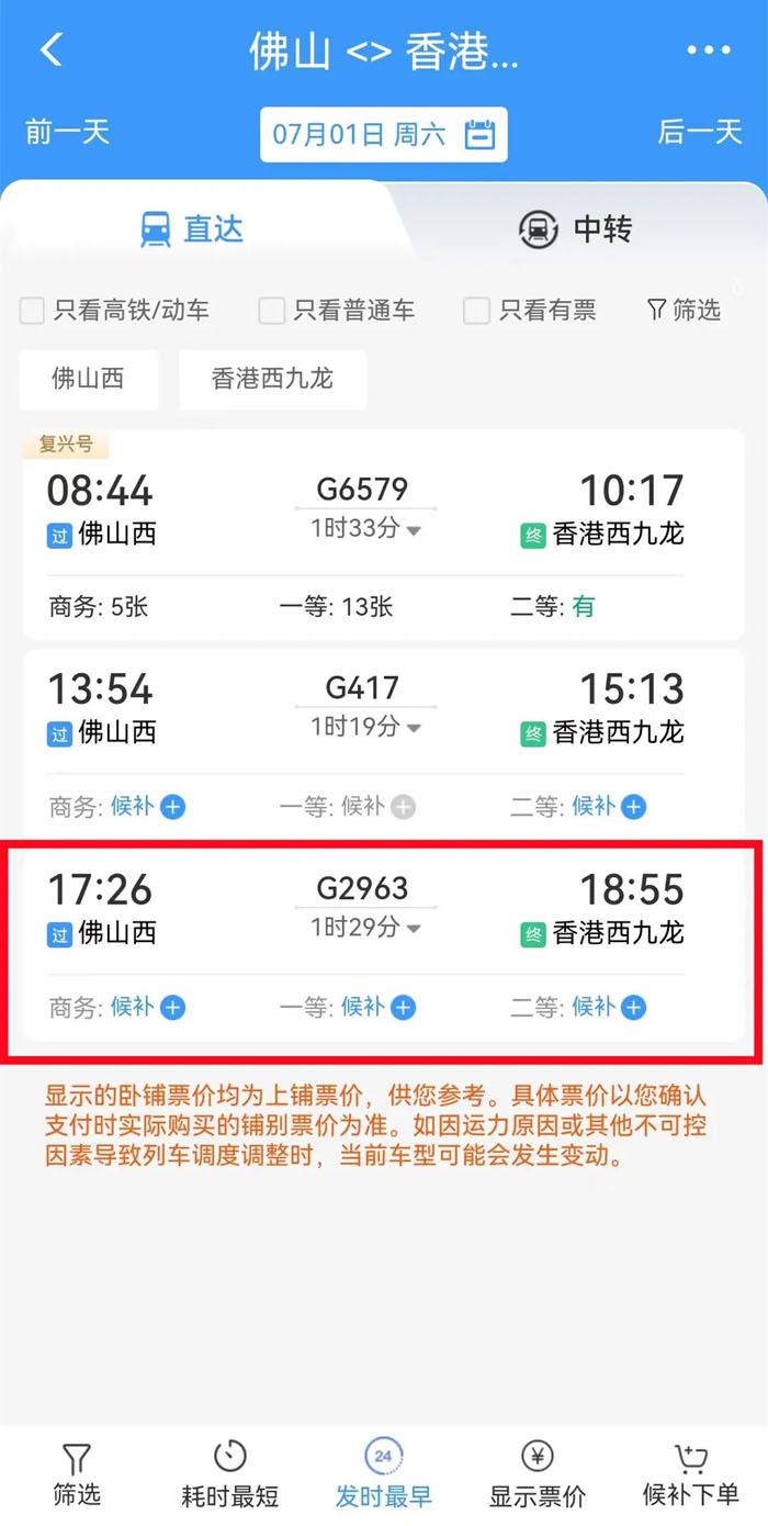 (7月1日起,从佛山西站到香港西九龙站共有3趟班次。)