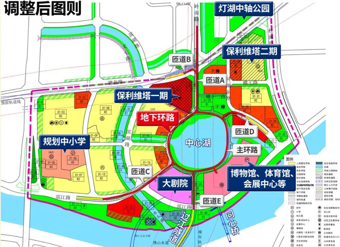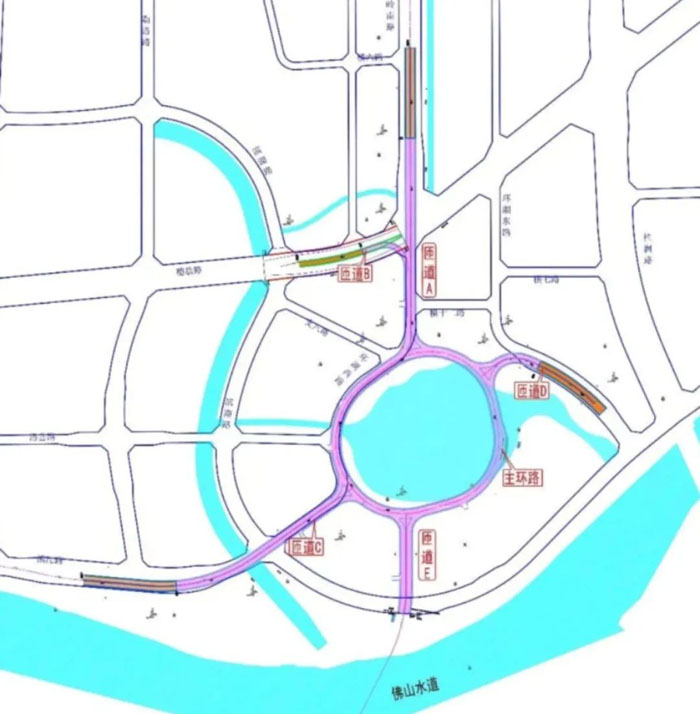 调整后的控规图显示,南海艺术中心片区地下环路主环路为艺术中心下方环形地下道路;匝道A、匝道B、匝道C、匝道D连接岭南路、穗盐西路、滨江路、环湖东路等,匝道E则与南向过江隧道相连。过江隧道与过江隧道西侧的人行天桥均在前期研究,有序推进。