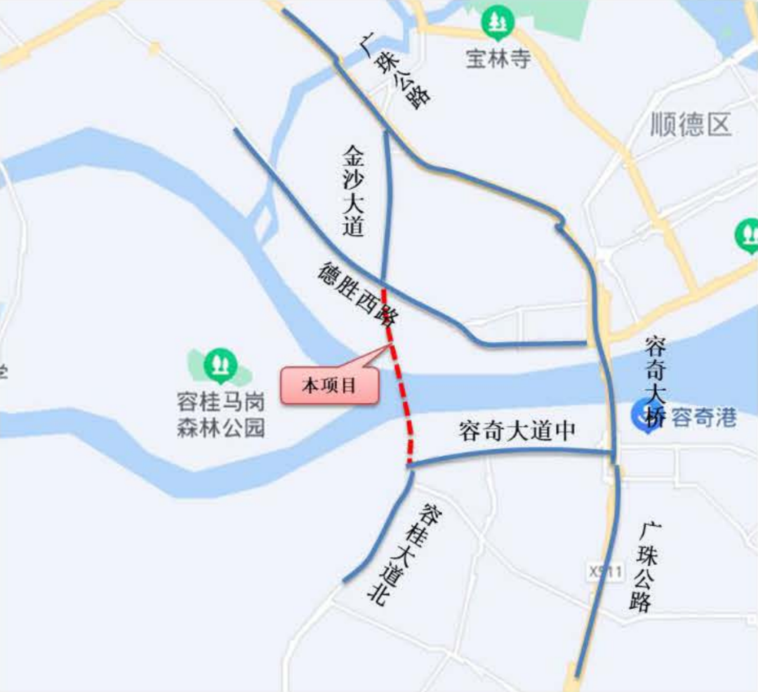 金沙大道为城市主干道双向六车道,容桂大道为双向六车道。随着容桂水道一河两岸改造进程的推进,现有的跨容桂水道的容奇大桥将难以承担更加承重的交通压力,故新过江通道的建设迫在眉睫。