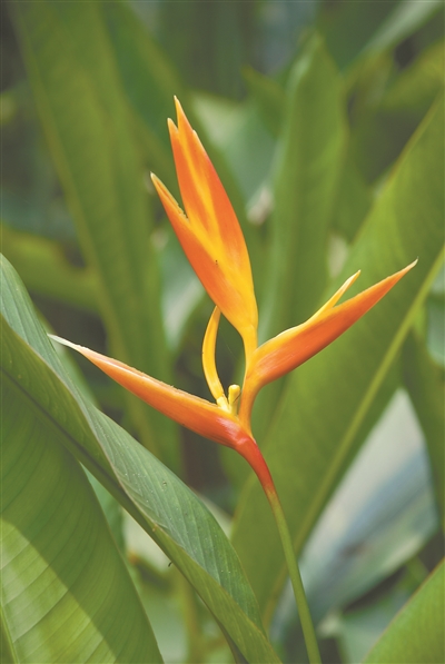 据华南国家植物园方面介绍,金嘴蝎尾蕉又名垂花蝎尾蕉、金嘴赫蕉、垂花火鸟蕉,是蝎尾蕉科蝎尾蕉属多年生草本植物。其鲜艳夺目的红色部分其实是苞片,真正的小花则藏在苞片之中。金嘴蝎尾蕉每年自进入夏季开始盛开,由于红色苞片的蜡质特性,花期可以一直持续到金秋。