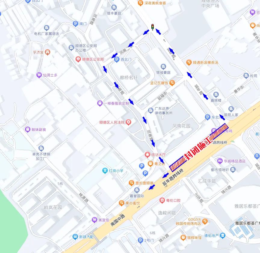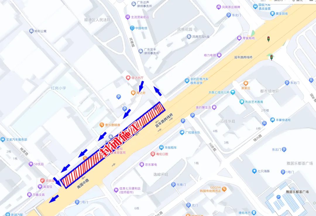 因顺德区南国路道路交通升级改造工程施工需要,从2023年7月12日起,对南国中路(延年路—桃源路段)北侧辅道分两阶段进行封闭施工,预计在2023年8月25日前完成施工,具体如下:
