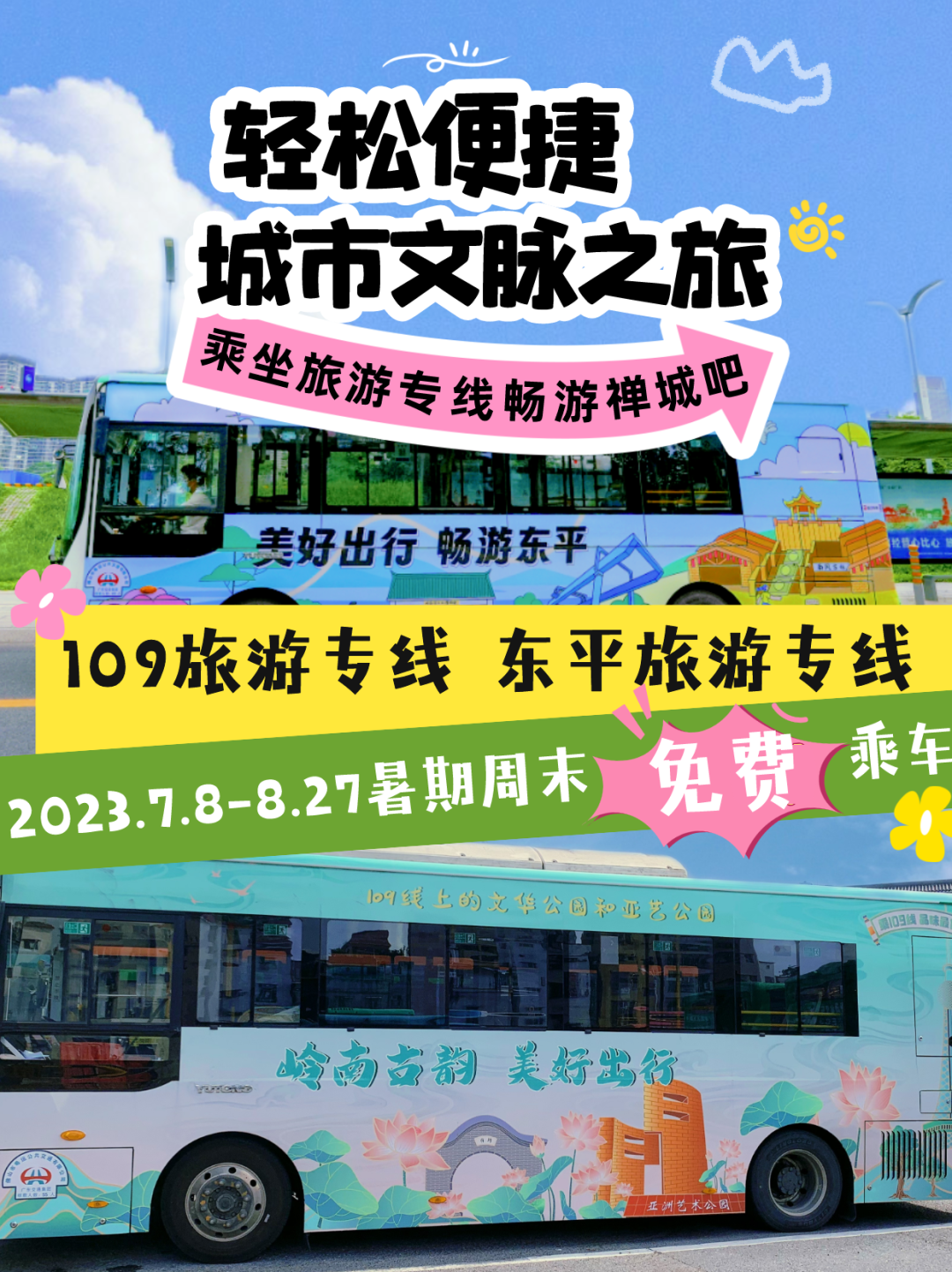 可以乘坐禅城区的旅游专线109线和东平路公交专线来一场惬意浪漫的禅城之旅呀!而且暑假期间,每逢周末都可以无限次免费乘坐这两条城市文脉主题旅游专线喔!