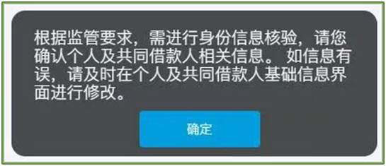 学生可以从系统中现有的共同借款人中选择一位,但不得新增共同借款人,如需增加新的共同借款人(或更换共同借款人),需要到禅城区教育局现场办理。但学生本人和共同借款人的信息必须完善,比如学生和共同借款人的身份证有效期、婚姻状态、职业等信息。如果不完善信息,系统将一直提示“根据监管要求,需进行身份信息核验……”(如下图所示)。