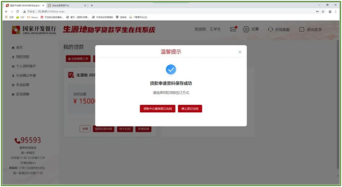 提交申请信息后,系统将提示学生选择“线上签订合同”或“资助中心现场签订合同”。如学生选择“资助中心现场签订合同”,系统将生成电子申请表供学生下载打印,并将相关信息发送至县资助中心,学生需持申请表到县资助中心现场签订续贷合同。如学生选择“网上签订合同”,需要同意《国家开发银行生源地助学贷款续贷远程受理协议书》,同意通过电子签名方式签订助学贷款合同,并明确双方法律责任。