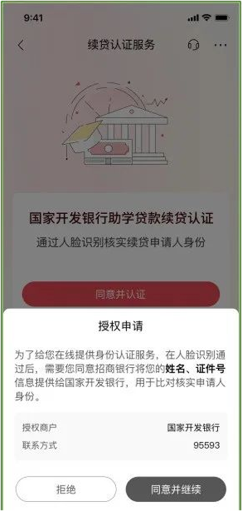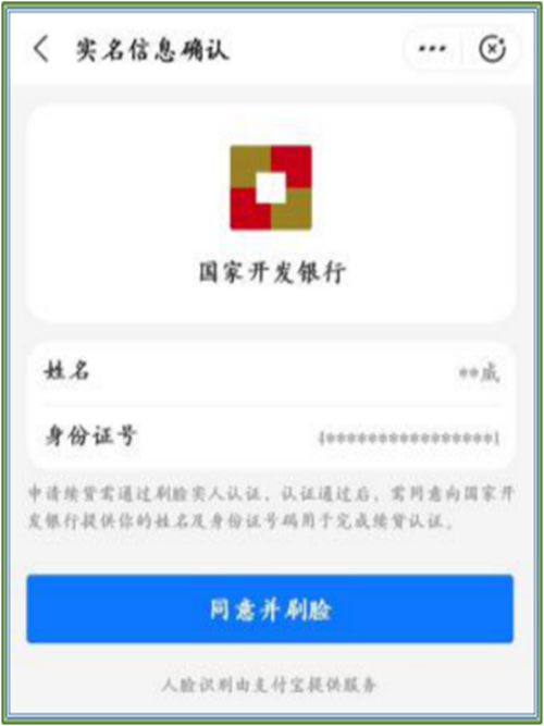 国家开发银行已委托支付宝公司(招商银行)进行身份证信息核实及身份认证相关工作,此时业务流程将跳转至支付宝(招行)APP进行,在完成身份认证后,再转回到国家开发银行在线服务系统继续办理。