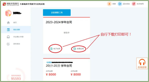 下图是审批完成后的界面,学生可自行登录学生在线系统,在“我的贷款”中找到今年的贷款合同的“电子合同”和“受理证明”。可自行打印电子合同和受理证明。(注:续贷初审通过后,该申请将显示为“审批中”,表示初审已经通过,正等待资金统一划拨;学生能自行下载打印合同和受理证明就表示初审已经通过了。)