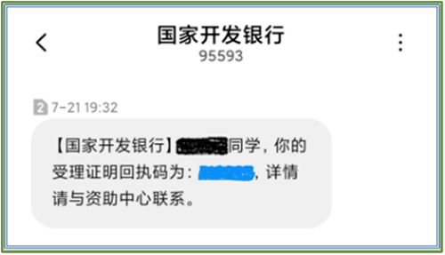 续贷远程受理的合同经县资助中心审查通过后,系统将向学生手机发送回执码短信,短信内容包括借款人信息、合同信息以及六位数字的合同回执码,学生可以在收到短信后登录在线系统,下载并打印受理证明。