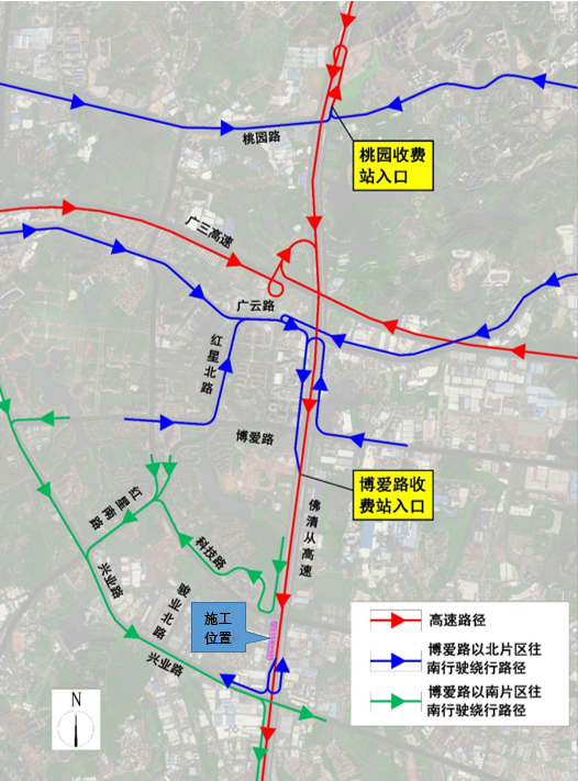 (1)来自博爱路以北片区需要往南行驶的车辆可经广三高速转佛清从高速主路,或绕行桃园路、广云路经桃园收费站或博爱路收费站进入佛清从高速往南行驶。