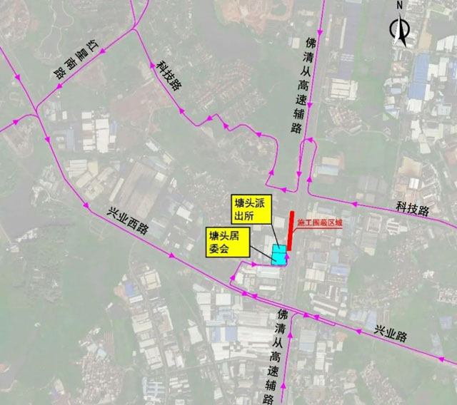 (3)前往狮山塘头派出所、塘头居委会车辆可绕行科技路、红星路至兴业路,在佛清从高速以东掉头口掉头后,经白边村村道、白油路前往。