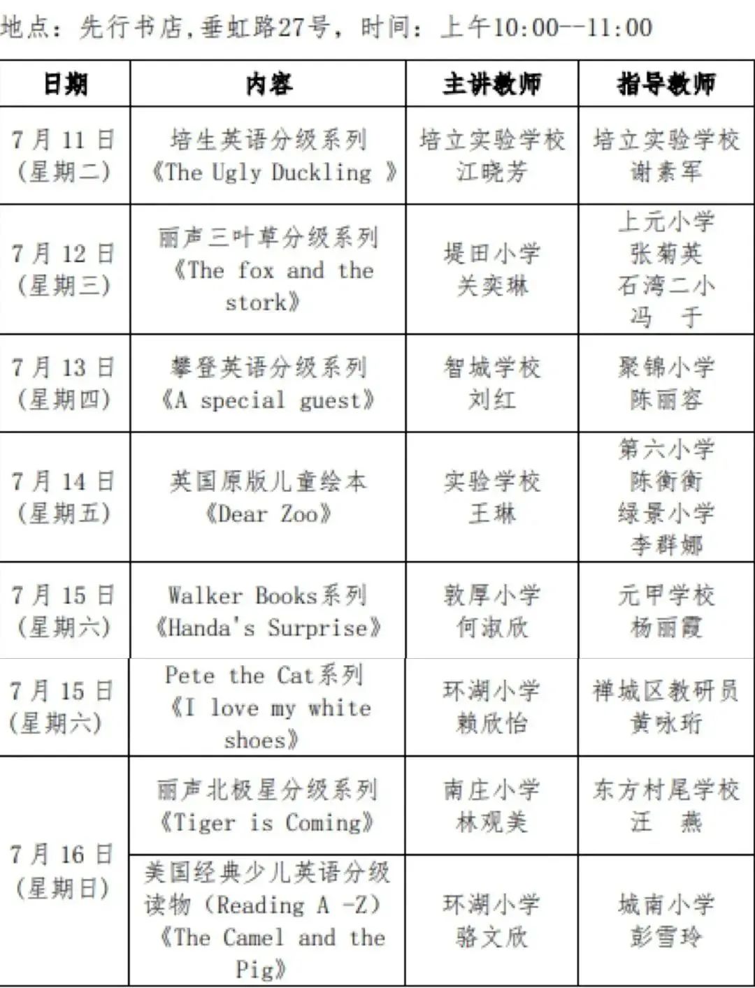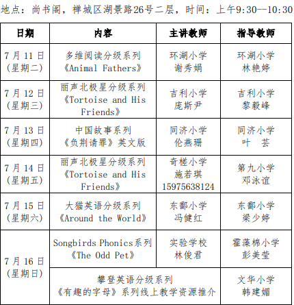 除了校内暑期托管,在7月11日至7月16日,禅城区教育局将分别在禅城区先行书屋和尚书阁开展第四届“亲近童书 阅读一夏”小学英语阅读推广活动。