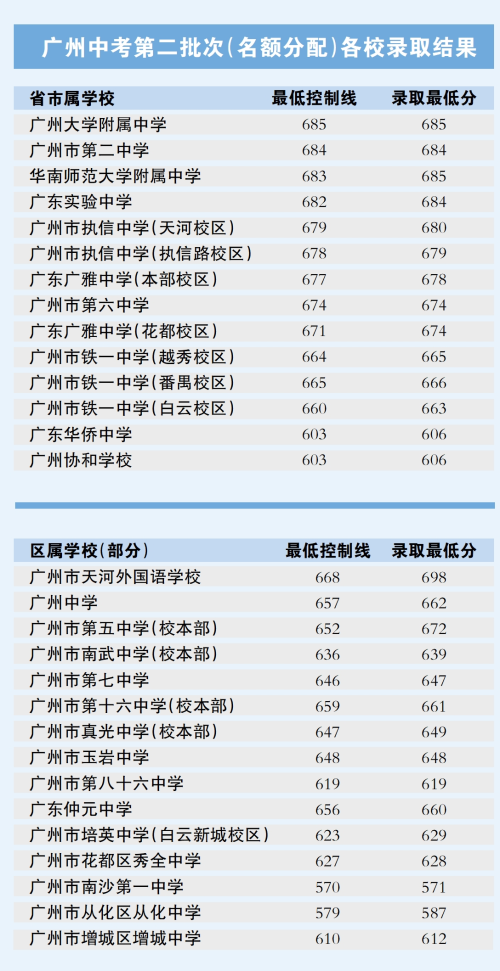 在相对薄弱的初中,学生享受到名额分配“红利”的可能性更大。记者发现,今年有不少来自增城、从化、花都的“超级锦鲤”。例如广州增城外国语实验中学有考生以685分进入华附,广州市从化区鳌头中学有考生以684分进入省实。