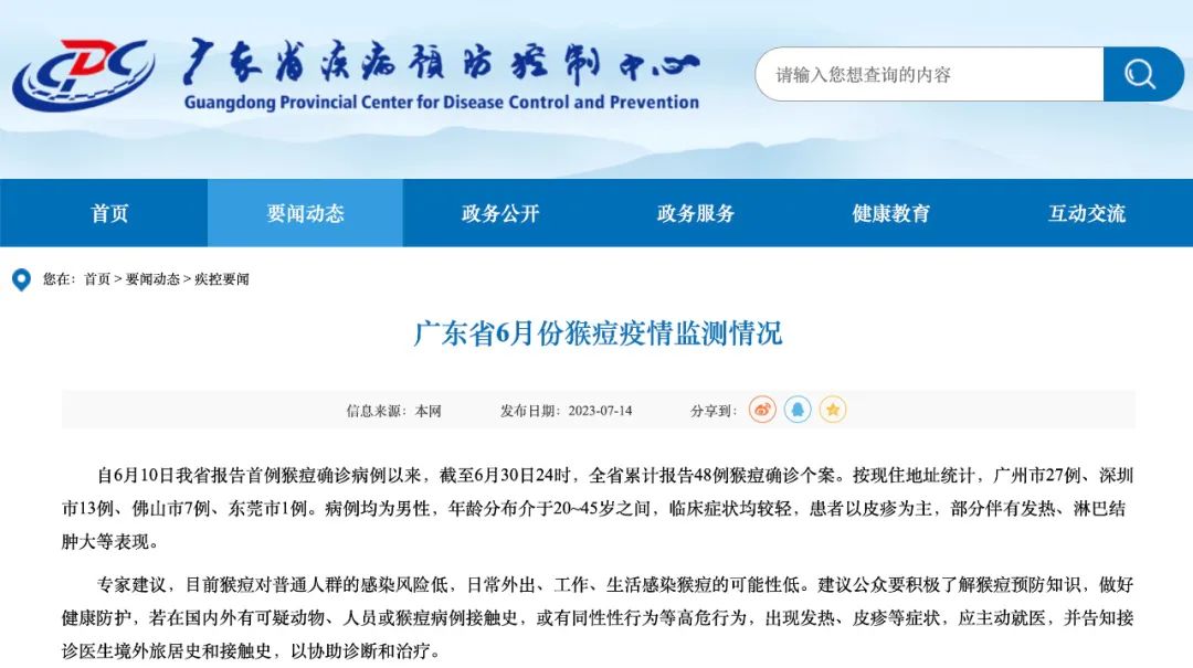 按现住地址统计,广州市27例、深圳市13例、佛山市7例、东莞市1例。病例均为男性,年龄介于20至45岁之间,临床症状均较轻,以皮疹为主,部分伴有发热、淋巴结肿大等表现。