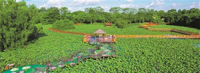 南沙湿地超百亩荷塘内荷花绽放,九曲莲花桥成为荷花节网红打卡点