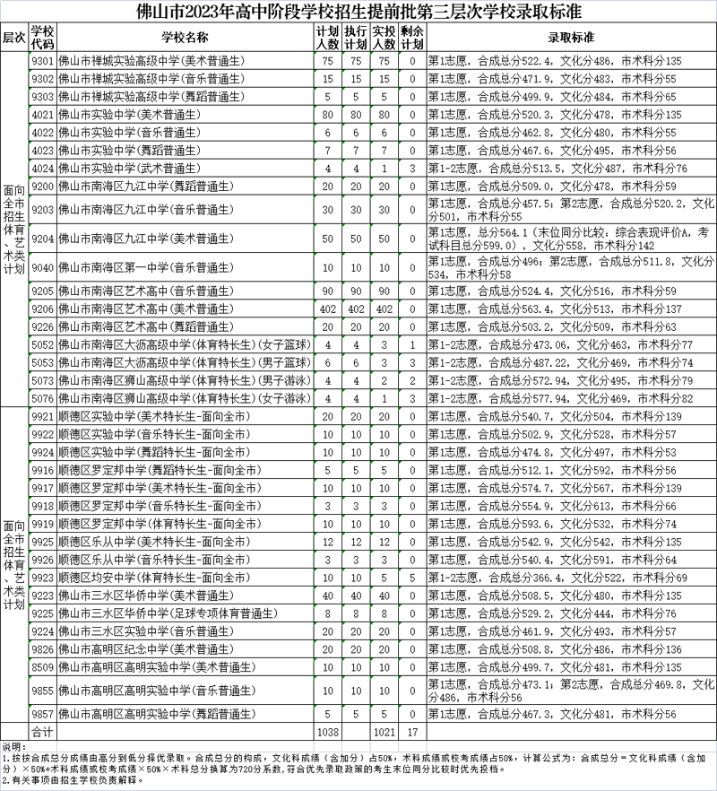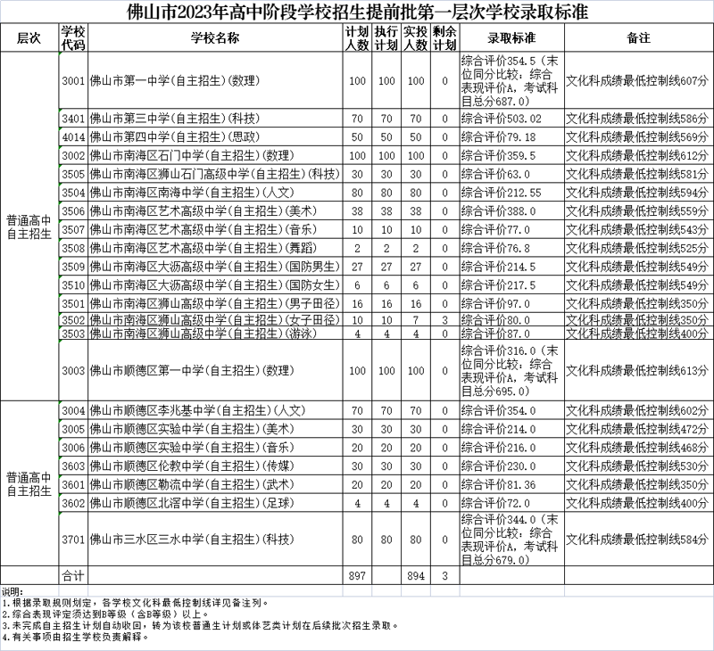 2023年佛山市高中阶段学校招生提前批录取控制分数线及学校录取标准如下: