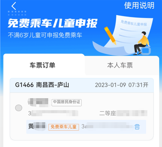 用户购票完成后,在铁路12306APP中的“火车票订单”或“本人车票”中进行免费乘车儿童申报操作。