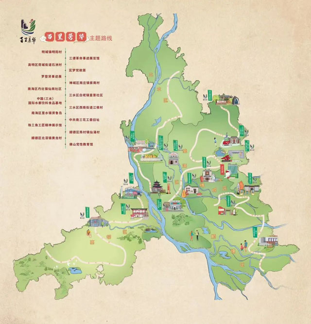 路线:高明区明城镇明阳村➔三谭革命事迹展览馆➔高明区荷城街道石洲村➔区梦觉故居➔罗登贤事迹展➔禅城区南庄镇紫南村➔南海区丹灶镇仙岗社区➔三水区白坭镇富景社区➔中国(三水)国际水都饮料食品基地➔三水区西南街道江根村➔南海区里水镇贤鲁岛➔中共南三花工委旧址➔珠三角工匠精神展示馆➔顺德区陈村镇仙涌村➔顺德区北滘镇黄龙村➔佛山党性教育馆