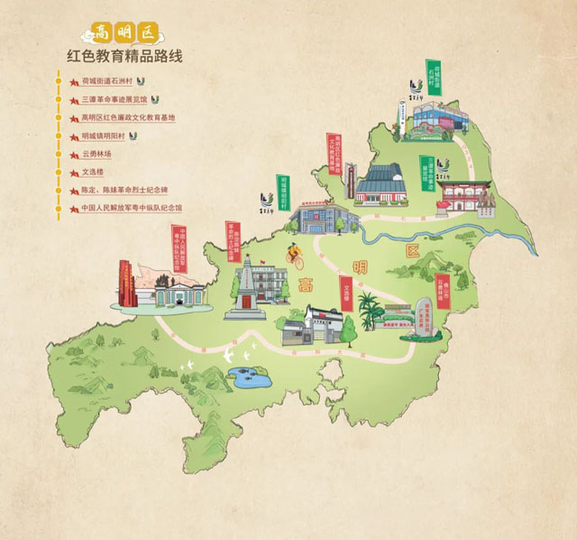 路线:荷城街道石洲村➔三谭革命事迹展览馆➔高明区红色廉政文化教育基地➔明城镇明阳村➔云勇林场➔文选楼➔陈定陈妹革命烈士纪念碑➔中国人民解放军粤中纵队纪念馆