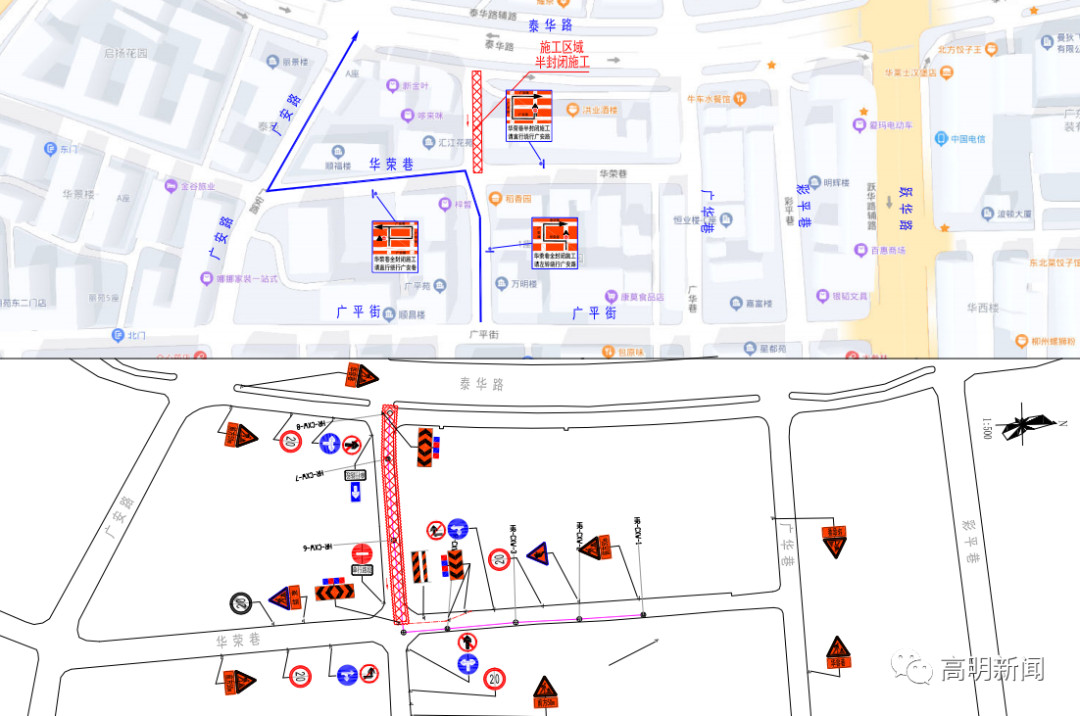在华荣巷施工工期为60天,施工期间,各位市民可以往广平街→广安路→泰华路进行绕行,华荣巷附近的市民可以华荣巷→广安路→泰华路进行绕行。